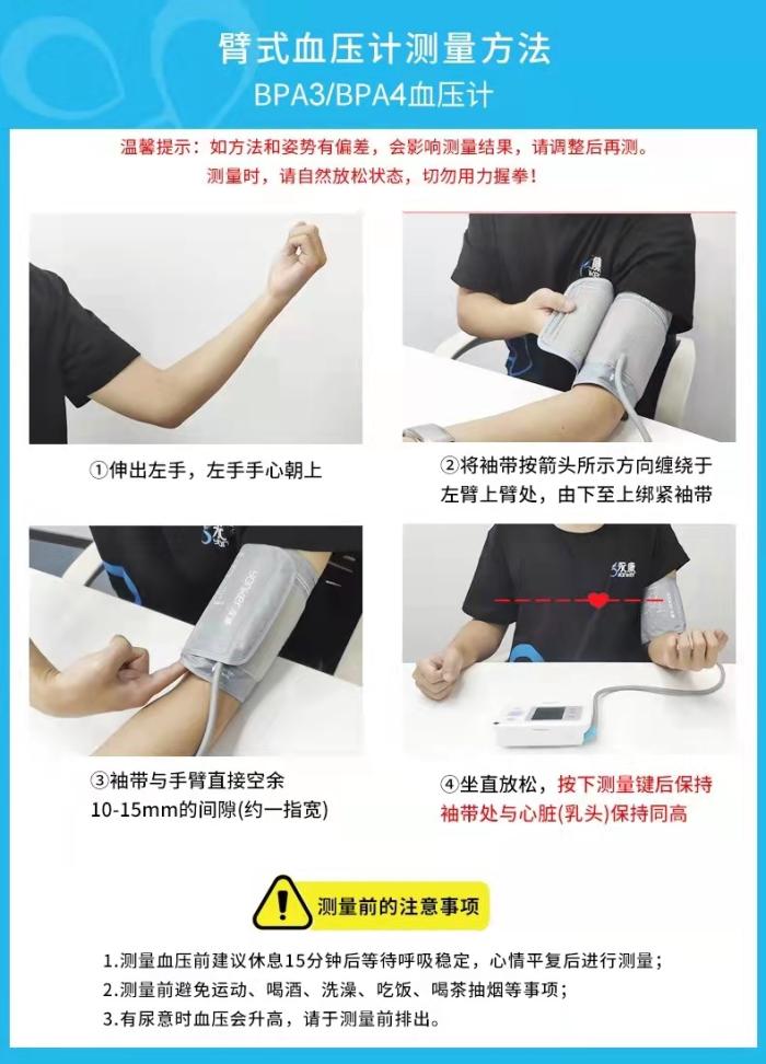 在使用电子血压计测量血压的过程中要注意,尽量使袖带和心脏保持在同一个水平。还应该注意好袖带的松紧程度,不能太松也不能太紧。在活动后尽量休息几分钟后再进行血压的测量,每天早晚固定时间测,相对监测误差小。
